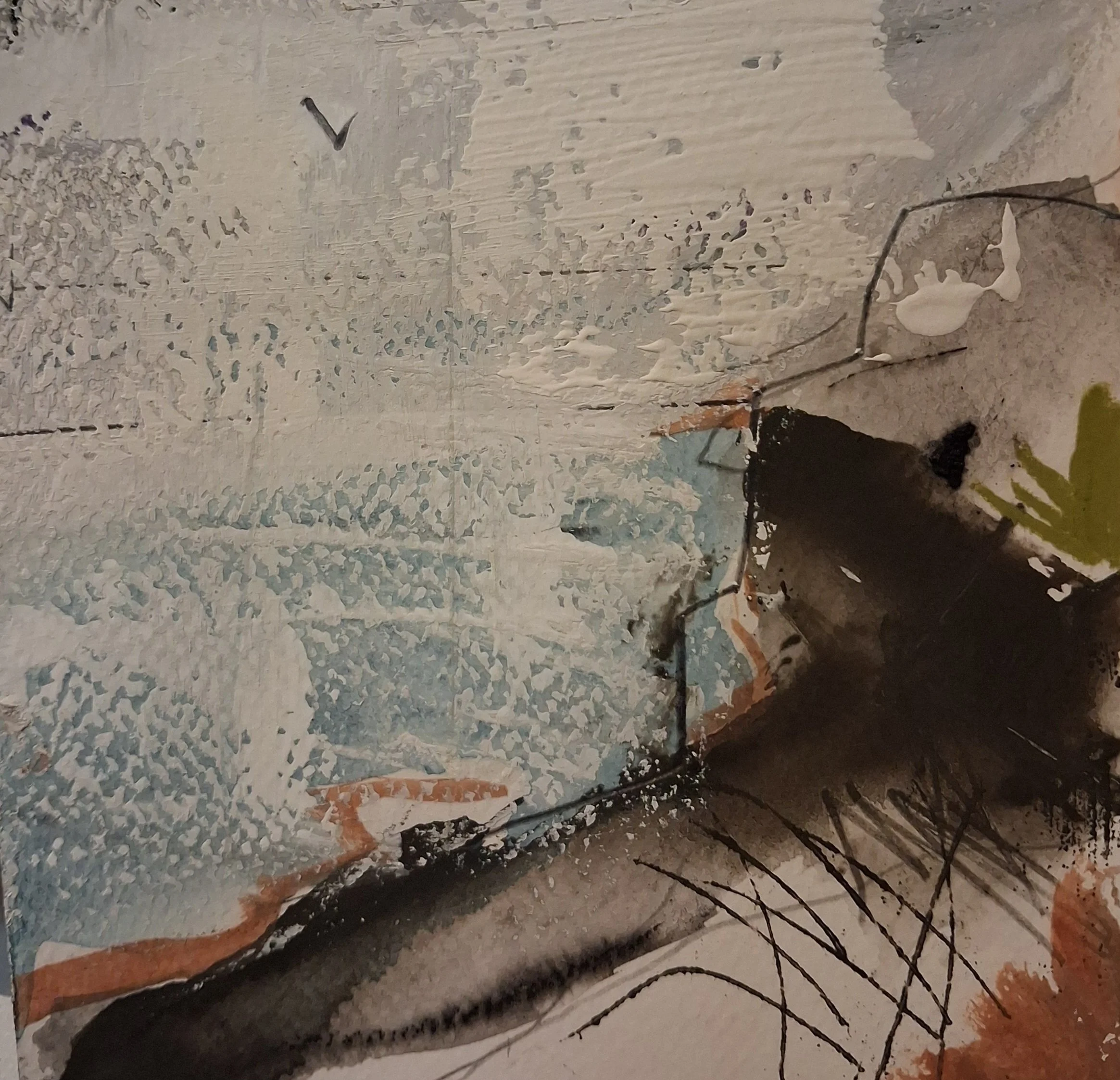 The process of applying the layers-which takes a lot of time as each layer has to dry completely- is quite meditative. Beautiful patterns appear, just hinted at below the surface as glazes of paint, a variety of marks and collage interweave with each other. I like the suggestion of something going on below the surface-just like any landscape has a geology, a history of human interventions and an abundance of life that goes on, sometimes apparent, sometimes hidden-I think it appeals to my curiosity.