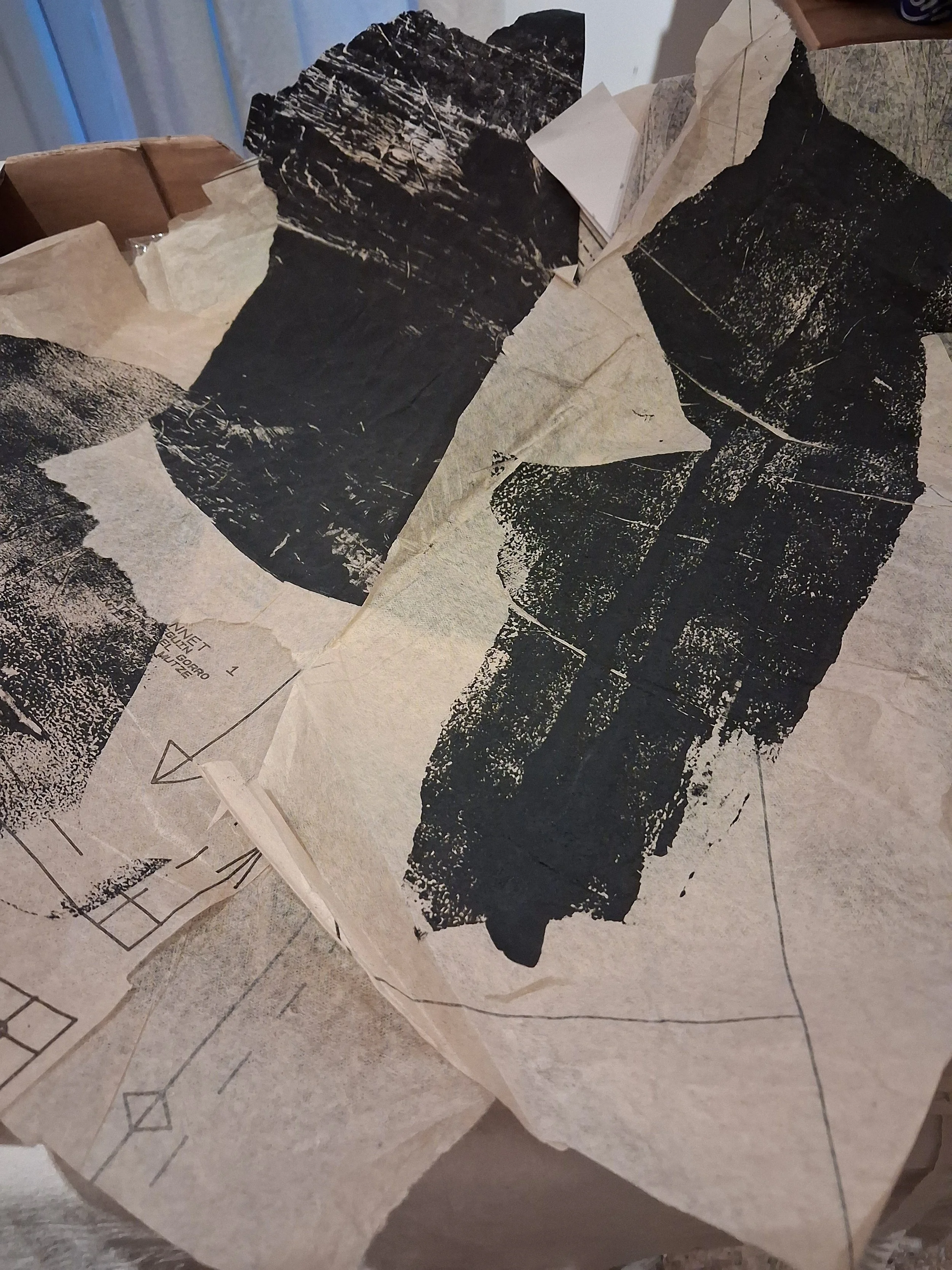 I use black collage tissue because I use coal, or ink for dark pigment and these can present problems when layering-coal will shift and bleed and ink will keep striking through to the surface-it seeps through the clay and leaves a stain. Hence I print all my darks and glue them down with wheat paste glue.