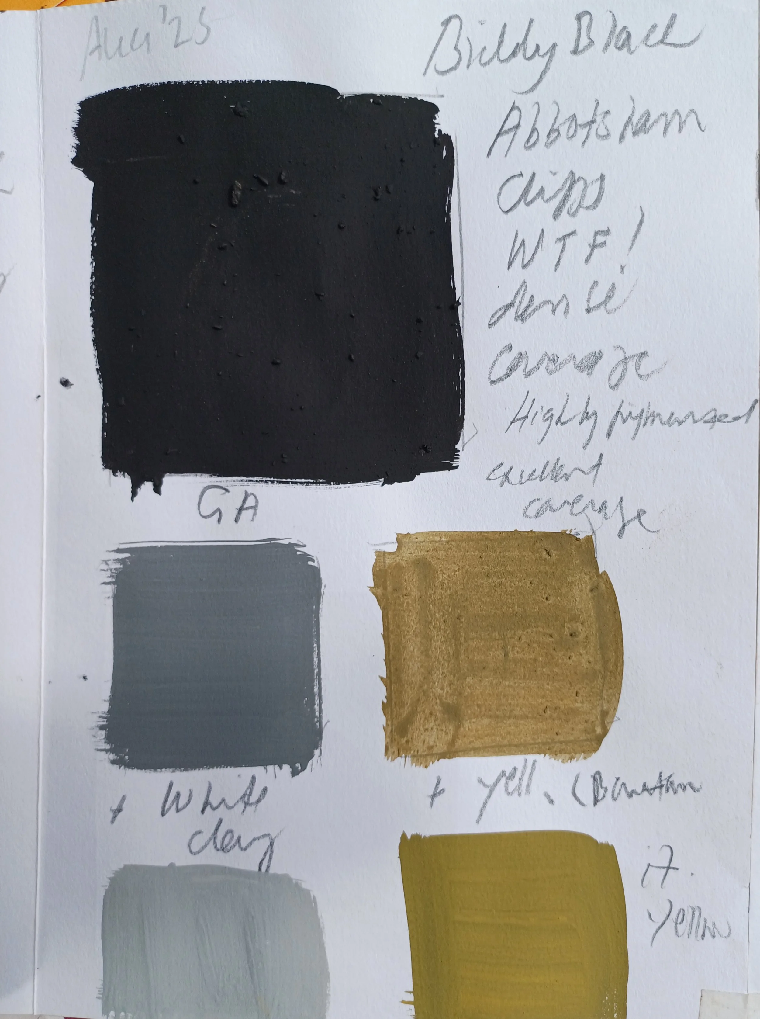 Beautiful thick coverage with Biddyblack-makes a wonderful green when mixed with Bourtan Lane yellow or Italian Earth
